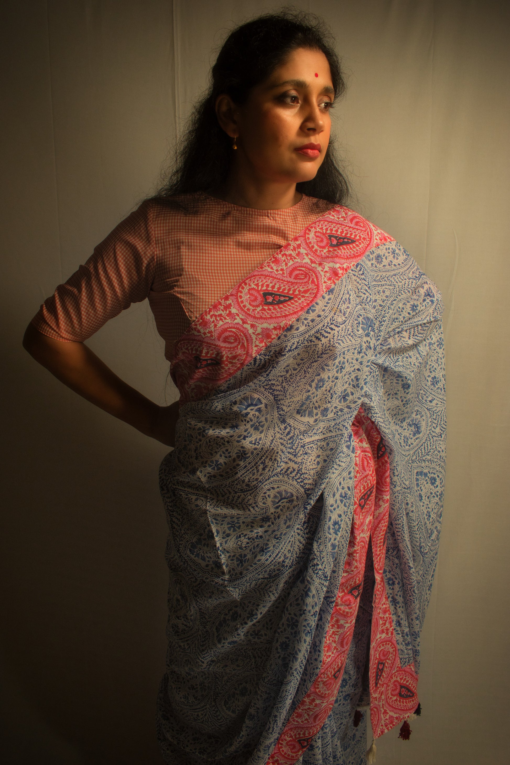 DESCRIPTION: THIS CUSTOM PIECE IS HANDCRAFTED WITH HAND BLOCK PRINTED SANGANERI MULMUL SOURCED ON OUR TRAVELS. A BRIGHT PEACH BORDER OF BOLD PAISLEYS PAIR UP WITH INDIGO PAISLEYS TO MAKE A BEAUTIFUL CONTEMPORARY STATEMENT SAREE.