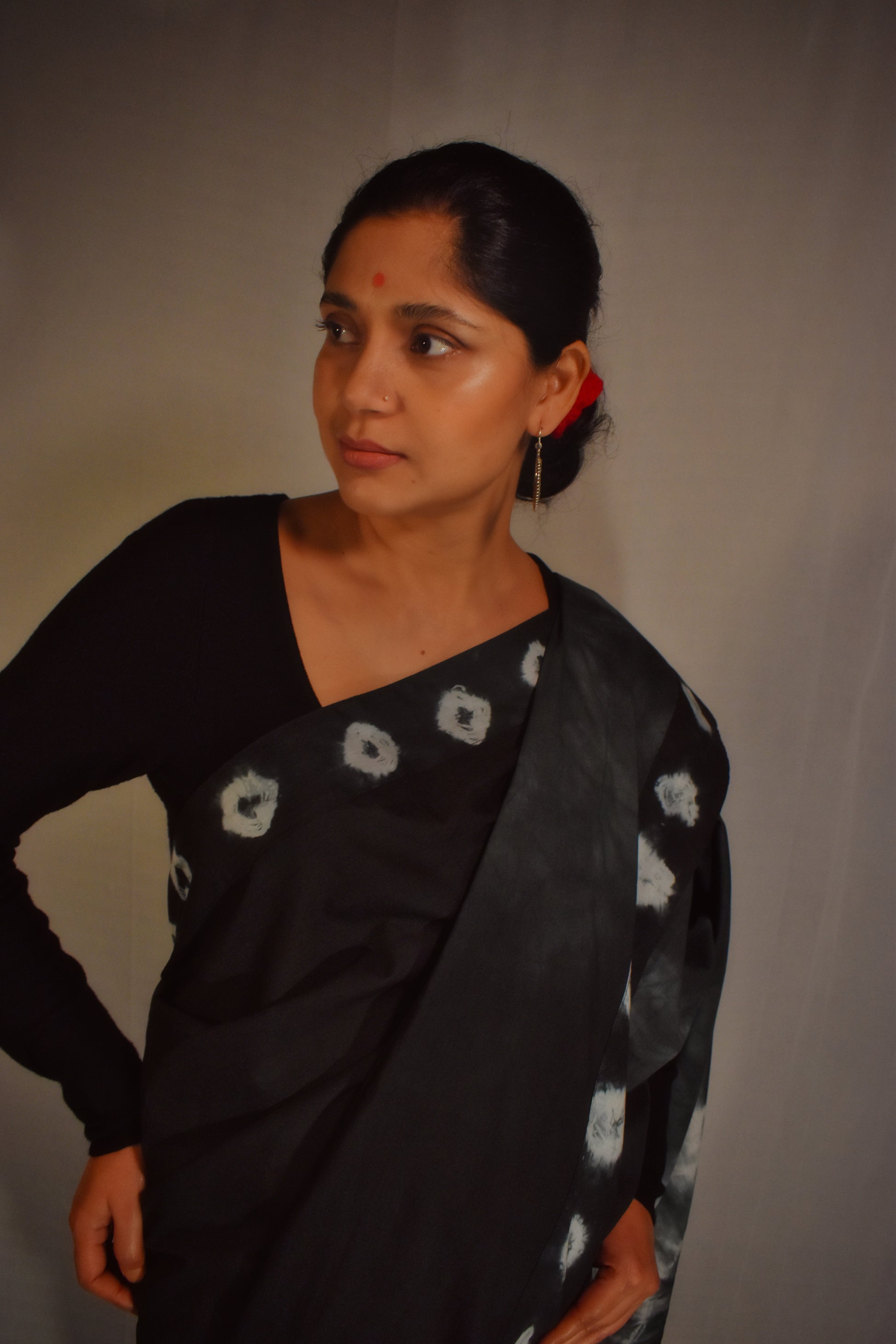 A LIMITED EDITION DESIGN MADE WITH THE MAIN MOTIF OF INDIAN BANDHEJ. THE PALLU BURSTS INTO LARGE BANDHEJ BLOSSOMS. ITS AN UNDERSTATED AND MINIMALIST TAKE ON INDIAN BANDHNI. INSTEAD OF BREAKING INTO A RIOT OF COLOURS, WE HAVE TAKEN A COUNTER INTUITIVE ROUTE TO MAKE THIS STATEMENT PIECE.