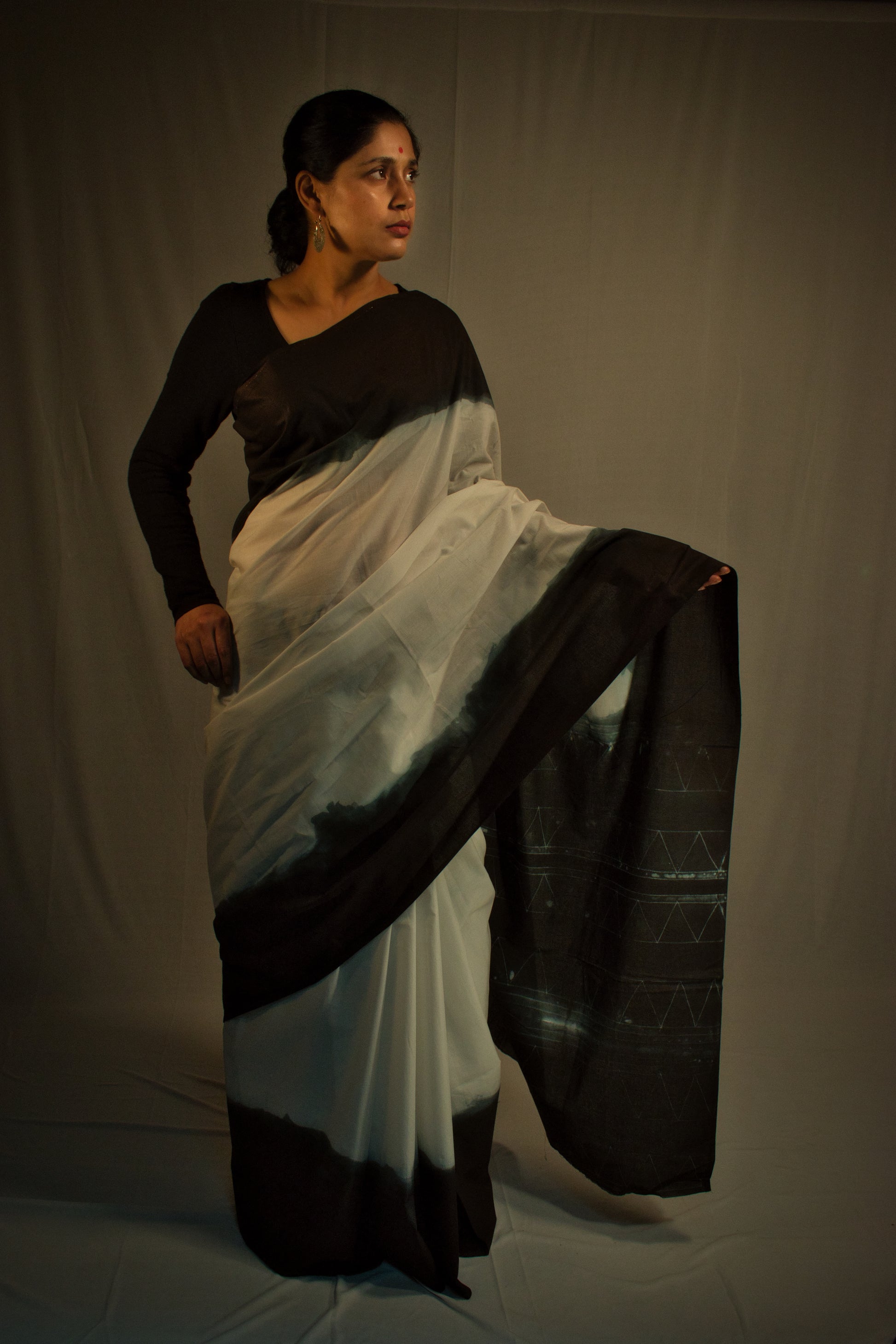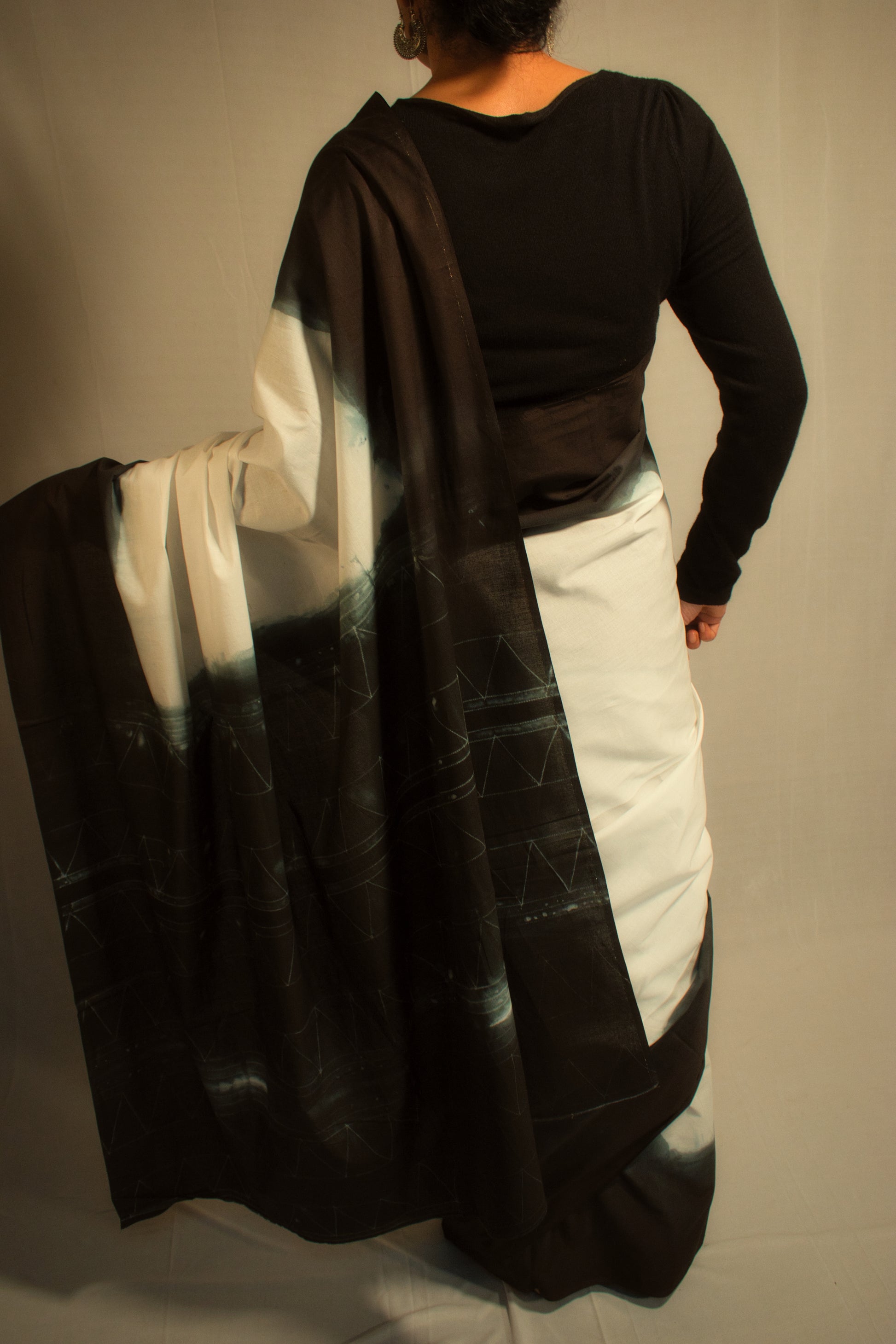 A LIMITED EDITION DESIGN FROM OUR SHIBORI COLLECTION. A CRISP WHITE COTTON SAREE WITH A GREY OMBRE BORDER AND A PATTERNED PALLU.