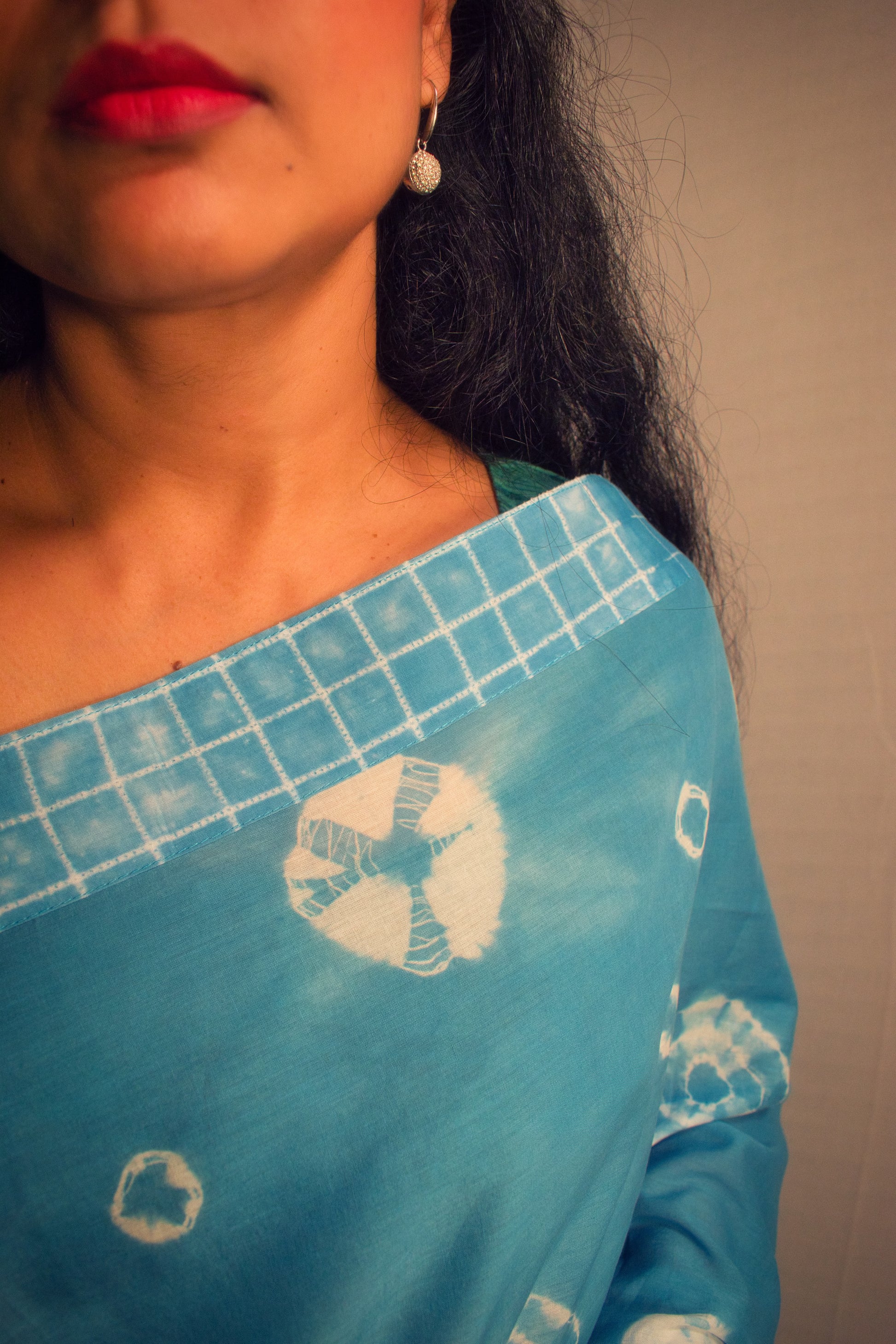 DESCRIPTION: SINGLE PIECE DESIGN, HAND DYED AND HAND CRAFTED IN PURE COTTON, THIS SAREE IS HAPPY LIKE A CLEAR BLUE SKY. A CONTEMPORARY TAKE ON TRADITIONAL BANDHNI.