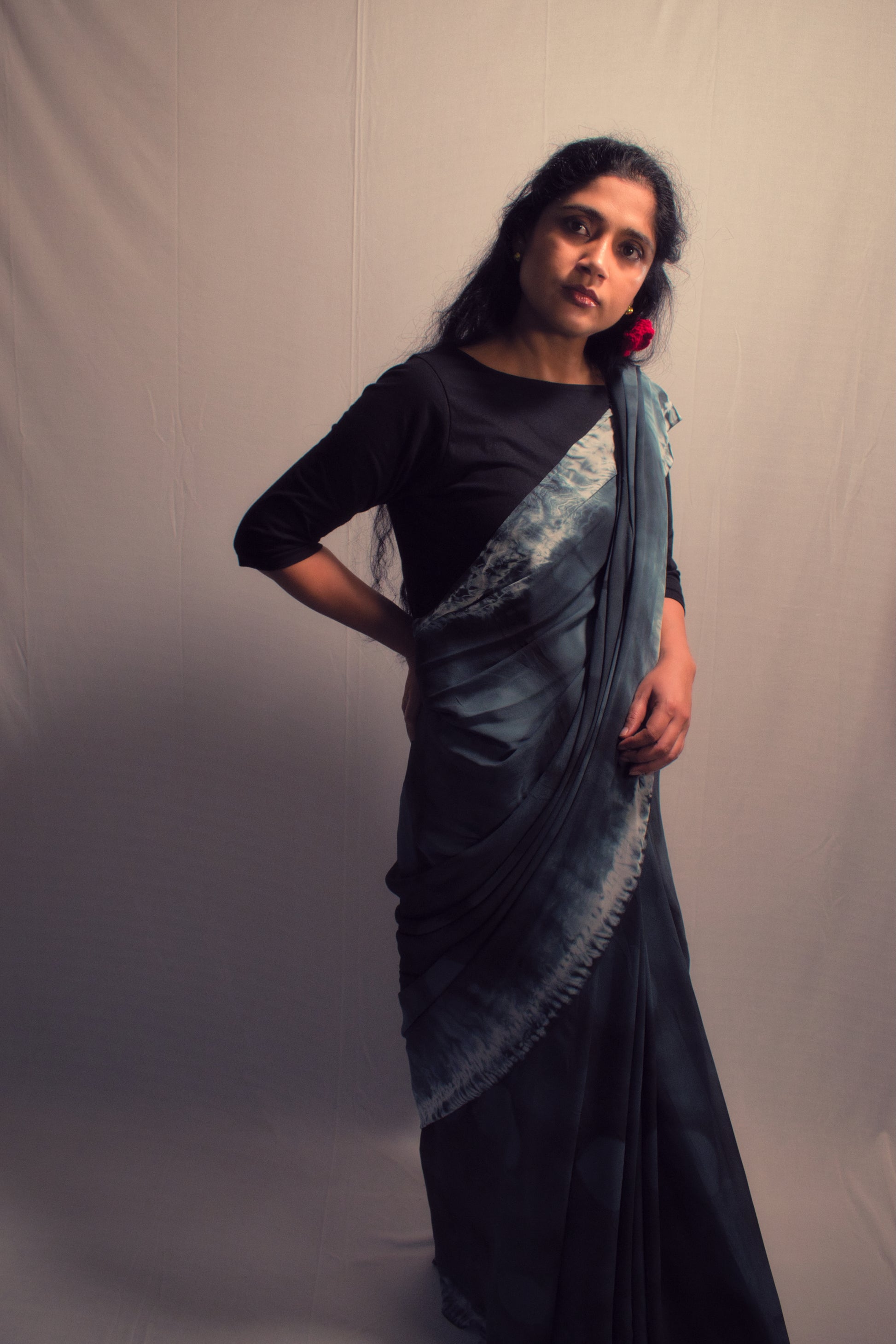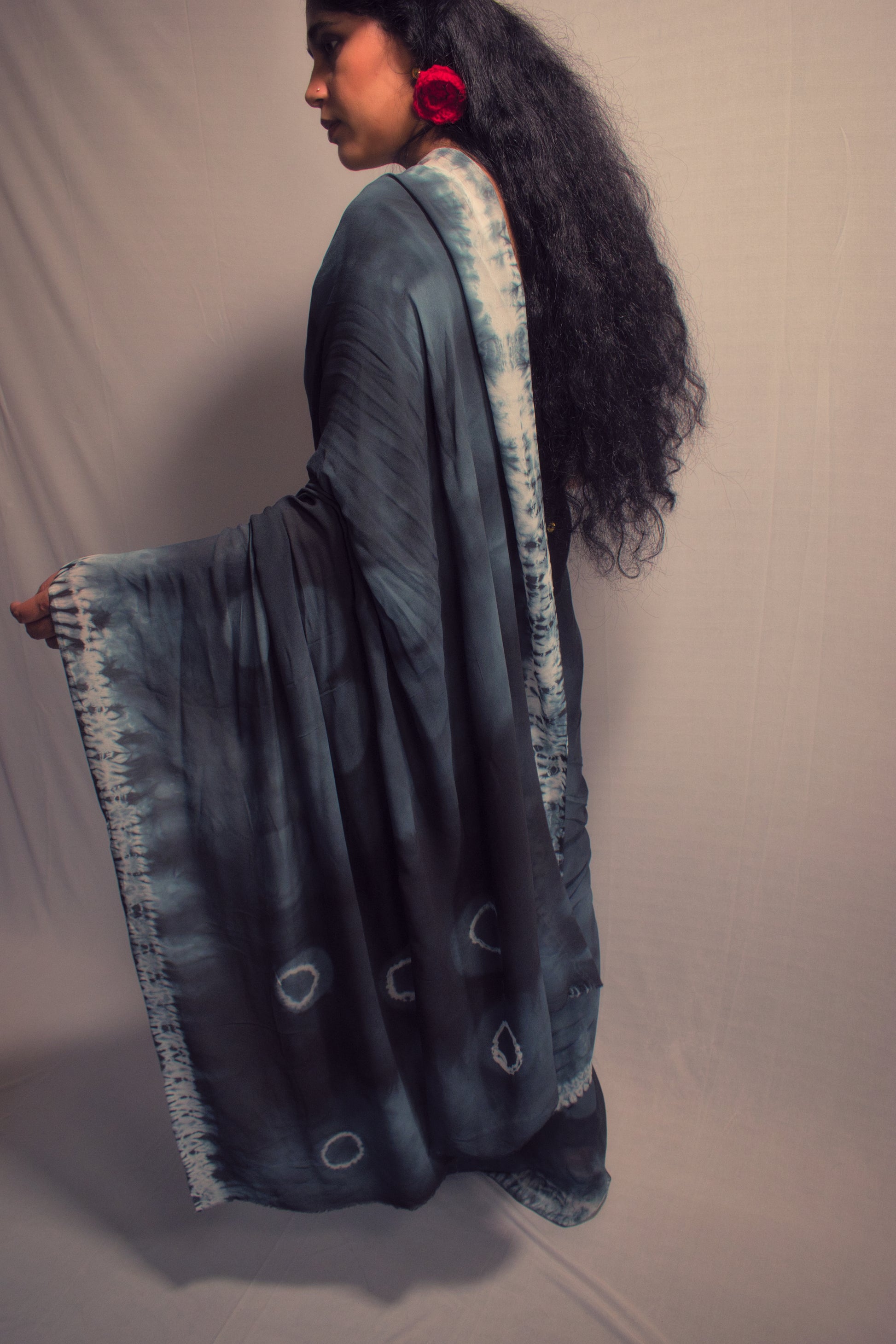 DESCRIPTION: DELICATELY CRAFTED SAREE FROM OUT STAIN SIGNATURE SHIBORI COLLECTION. A SINGLE PIECE EXCLUSIVE DESIGN - BLUISH GREY MOON PATTERNS OVER A CHARCOAL GREY BODY. THE BORDER AND PALLU ARE SUBTLY ACCENTED.