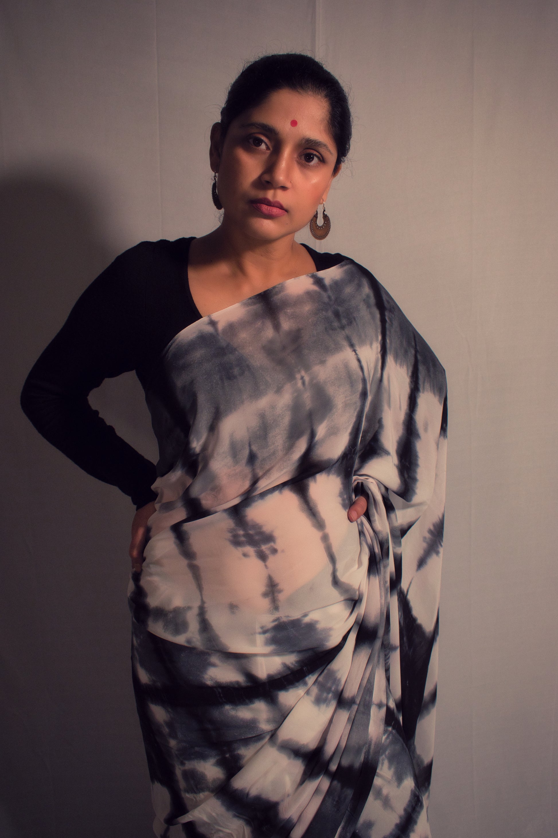 DESCRIPTION: PARADOXICAL LIKE A ZEN KOAN, THIS HANDCRAFTED SHIBORI SAREE IS A BEAUTIFUL PLAY OF INKY AND WHITE. A SINGLE PIECE DESIGN, THIS IS A STATEMENT PIECE, UNREPLICABLE LIKE NATURES OWN PLAY. HAND DYED IN PURE GEORGETTE IN OUR STUDIO, THIS IS MORE ABSTRACT ART AND LESS SAREE.