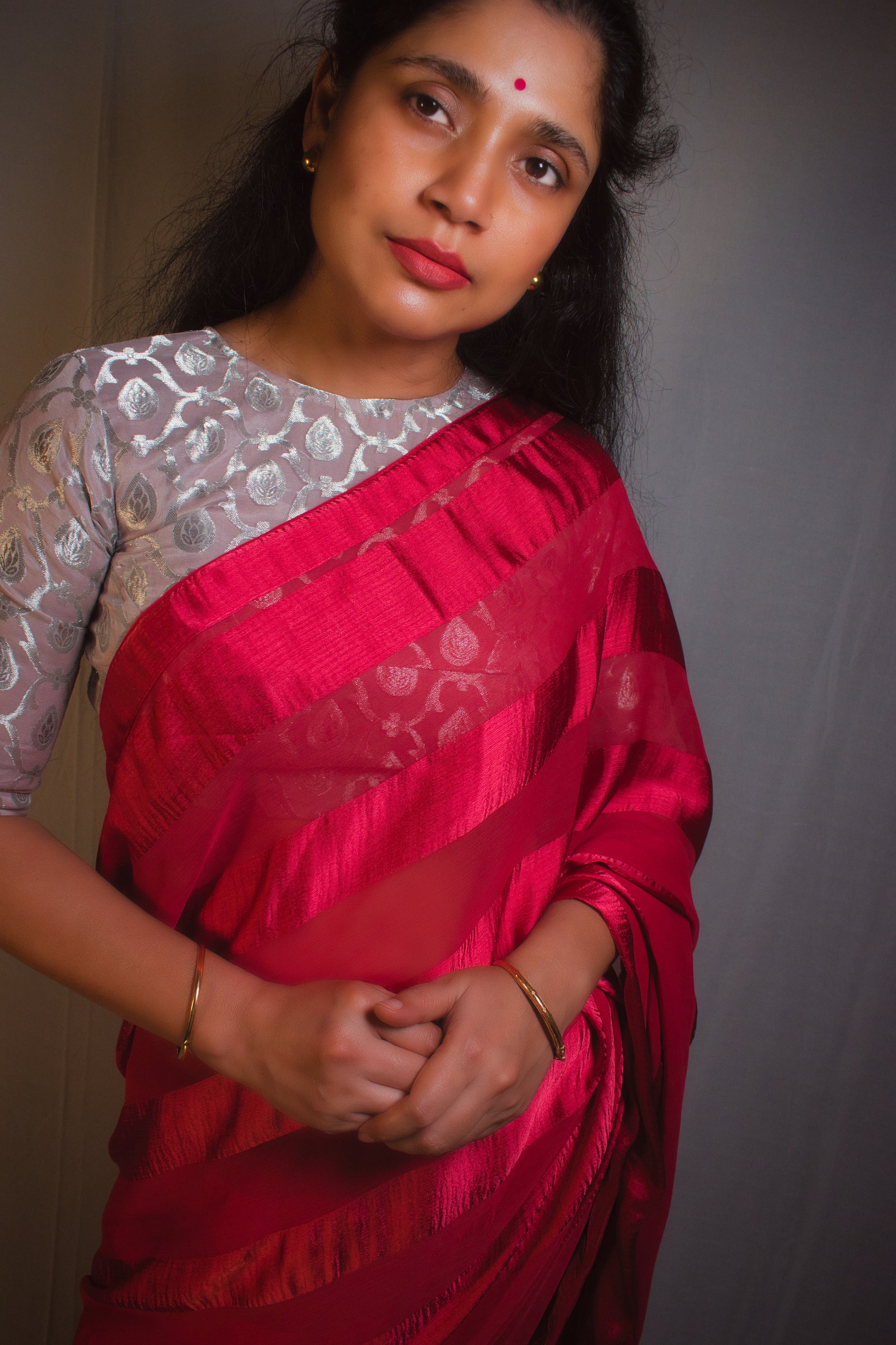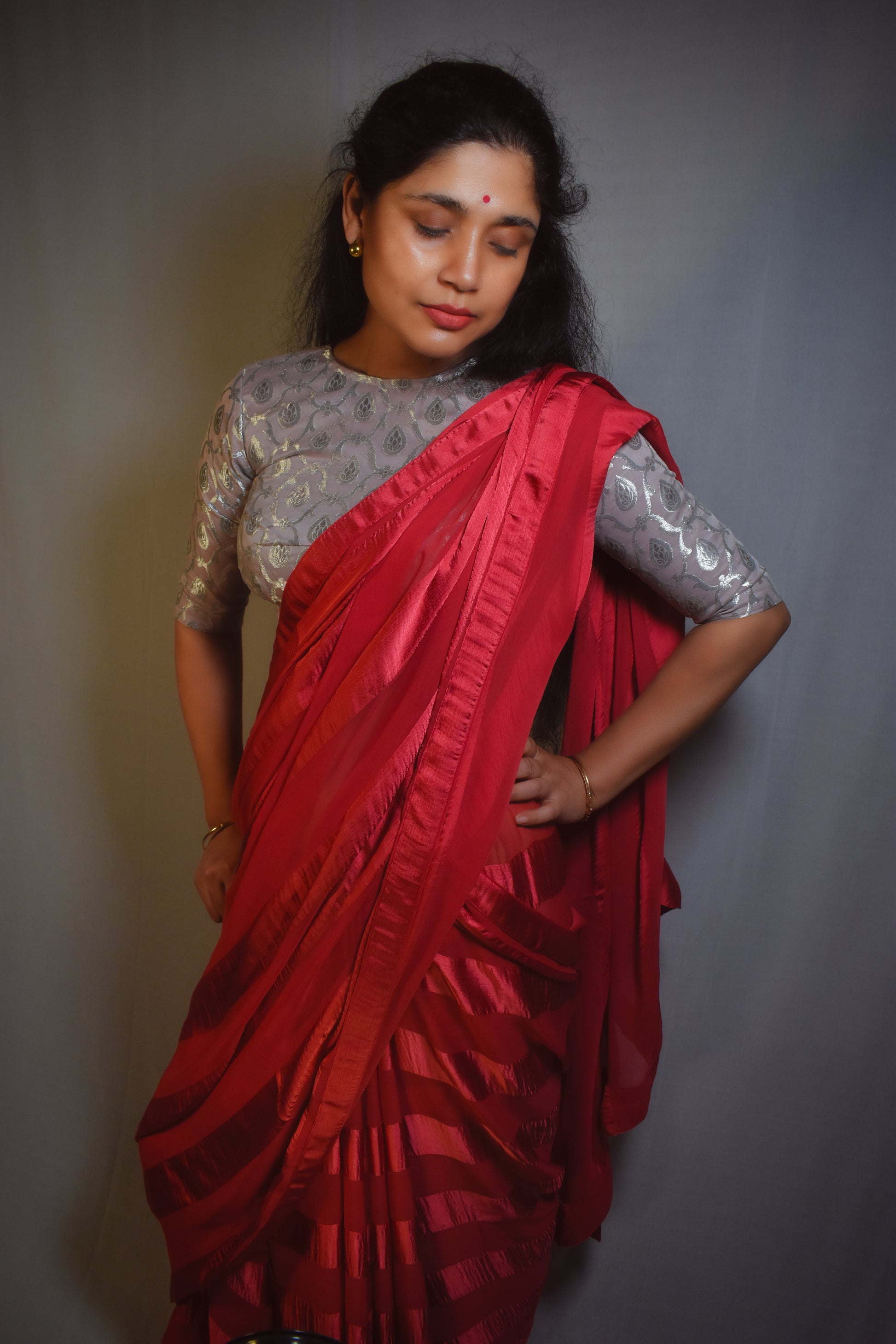 DESCRIPTION: THIS GEORGETTE SATIN SAREE HANDCRAFTED IN RICH FUSCIA AND TEXTURED WITH A BORDER IN THE SAME TONE IS GLAM QUEEN ALL THE WAY. THE FLOW AND TEXTURE ADDS TO THE RICHNESS OF THE LOOK. MADE AS A LIMITED EDITION DESIGN.
